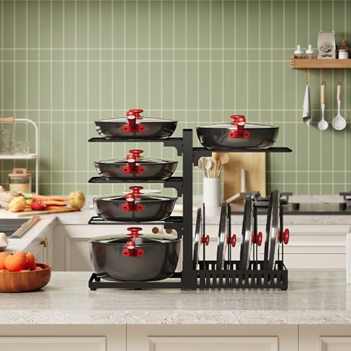 VDOMUS Pan Organizer Rack with 3 DIY Methods, Height Adjustable Kitchen Pan and pot Lid Holder (Black)