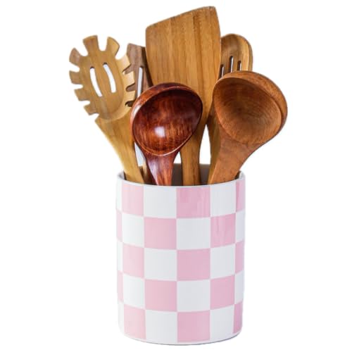 Swkien Utensil Holder锛7.2 Inch Checkered Utensil Holder, Ceramic Cooking Utensil Spoon/Spatula Holder for Countertop, Kitchen Decor and Accessories for counte(Purple)