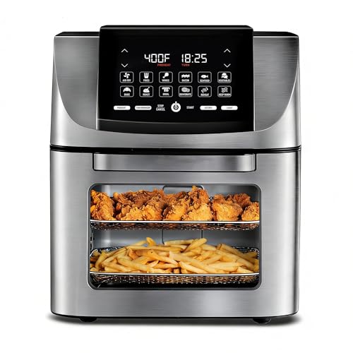 Granitestone 16Qt Extra Large Glass Air Fryer Non Toxic 鈥 Family Sized 4 in 1 Cooker with 3 Cooking Sections, Stainless Steel Racks for Fries, Chicken, No Preheat, Self Cleaning, Dishwasher Safe