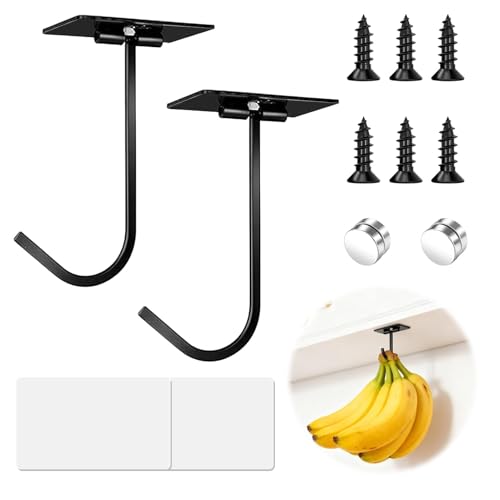 2Pcs Black Banana Hook Under Cabinet, Adhesive Banana Holder Hanger, Metal Banana Hook to Keep Bananas Fresh, Kitchen Accessories Items, Folds Up When Not in Use Space Saving