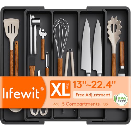 Lifewit Silverware Drawer Organizer Tray, Plastic Cutlery Storage for Kitchen Drawer, Flatware and Utensil Holder Divider for Spoons Forks Knives Tableware, 7 Compartment, Black