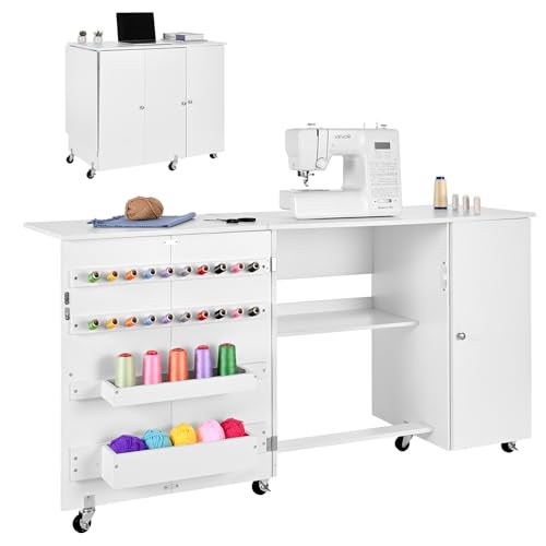 Large Folding Sewing Table, Double-Opening Side Cabinet, Rolling Sewing Machine Cabinet Craft Station Desk with Lockable Wheels Shelves, Storage Trays, etc for Apartment Small Spaces, Home, Bedroom
