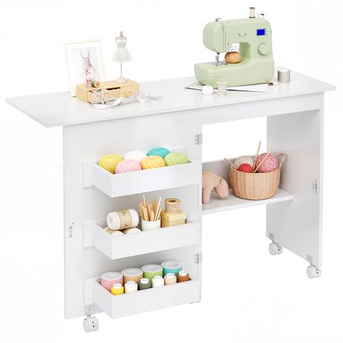 MELLCOM Home Hobby Craft Table with Storage Shelves, Mobile Folding Cutting for Large Fabric, Foldable Office Sewing Room White Fixed Height 35.5in