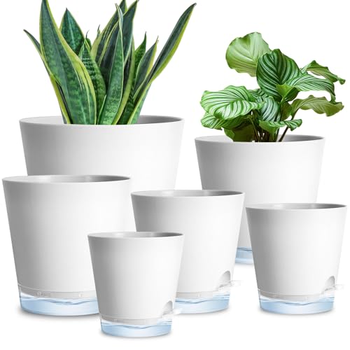 Plant Pots, Set of 2 10'' Self Watering Plastic Planter with Drainage Hole and Saucer, Modern Decorative Flower Pot for Indoor Outdoor House Plants, Succulents, Flowers