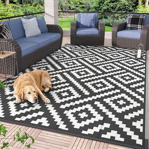 Outdoor Rug Carpet Waterproof Patio Rug 5x8 ft-Portable RV Camping Rug Mat-Non Fading Outdoor Area Rug for Deck Picnic Balcony Backyard Porch Beach Reversible,Black & White