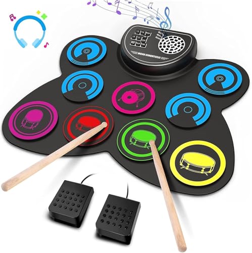 HXW PD405 Tabletop Electric Drum Set with 70 Electronic and Acoustic Drum Kit Sounds, Built-in Speaker, 4 Pads, 2 Pedals and Drum Sticks, Ideal Gift for Teens and Adult Beginners