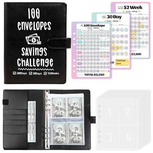 100 Envelope Savings Challenge Binder, PU Leather 100 Envelope Challenge Binder, with 12 Budget Sheets and 2 Purpose Stickers Kit, 100 Day Savings Challenge Envelopes Total C$5050 Cash