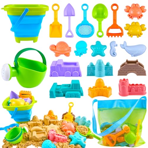 FUNWEGOT Beach Sand Toys Set Includes Collapsible Buckets 2 Big Size Sand Shovels, Rake, Animal Sand Molds Toys with Mesh Bag, Sandbox Kit for Kids Age 3+(22 PCS)