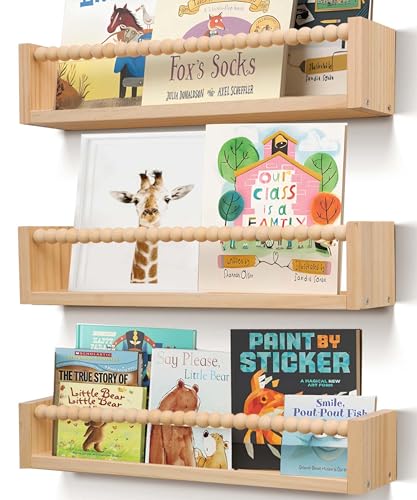 Esonal Set of 3 Kids Floating Bookshelves White 鈥 24 Inch Wall Mounted Nursery Book Shelves with Safety Rail 鈥 Ideal Storage & Display Shelf for Nursery, Bedroom, and Playroom