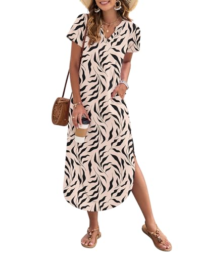 Women's Summer Dress Loose Fit V-Neck Casual Cotton Linen Lounging Dresses Short Sleeve Travel Midi Shift Dress