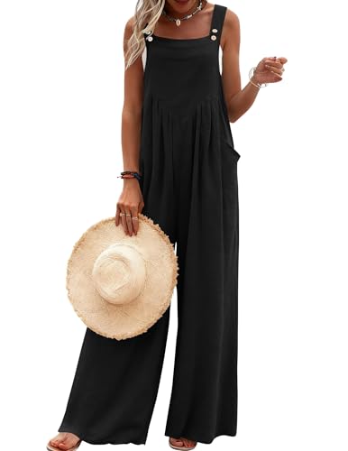 Women Button Down Jumpsuits Sleeveless Cotton Linen Wide Leg Rompers Loose Fit Casual Overall with Pockets