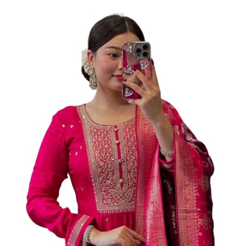 Womentus Women's Banarasi Silk Kurta Set, Embroidered Neckline, Floral Printed Dupatta, 3-Piece Salwar Suit
