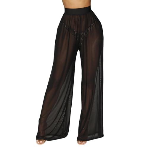 Women Ruffle Sheer Mesh Pants See Through Bikini Bottom Swimsuit Cover up Wide Leg Beach Pants