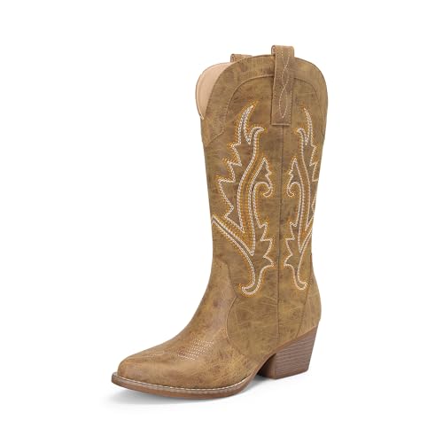 Foscape Cowboy Boots for Women, Knee High Cowgirl Boots with Chunky Heel, Snip Toe Side Zipper Padded Embroidery, Ideal for Low Instep, Fashion Western Boots for Daily & Festival Wear