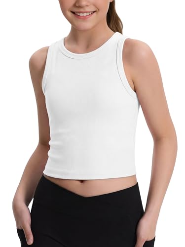 Girls' Crop Tank Top with Heart Embroidery, Soft Ribbed Sleeveless Racerback for Dance, Sports & Layering (8-14Y)