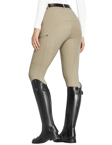 Oplxuo Women's Horse Riding Pants High Waisted Stretch Equestrian Breeches Horseback Schooling Tights with Side Pockets Khaki