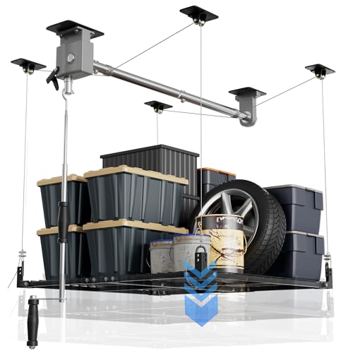 Overhead Garage Lifting Storage Rack, 4x4 ft Heavy-Duty Carbon Steel Ceiling Storage Rack, Adjustable Organization System, 350Lbs Safe Load (Tested to 600Lbs), Manual Crank Lift Design