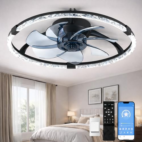 addlon 20 inch Farmhouse Flush Mount Ceiling Fans with Lights and Remote, Small Black Caged Low Profile Fandelier, 6 Speeds Bladeless Ceiling Fan for Bedroom, Kitchen, Living Room, Indoor