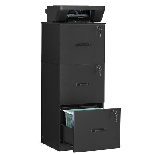 IFANNY 3 Drawer File Cabinet with Lock, Wooden Printer Stand w/ 5 Casters & 2 Side Hooks, Small Under Desk Storage Cabinet, Mobile Filing Cabinets for Home Office, Living Room, Study (Black)