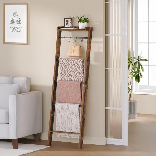 FUIN 6.4ft Extra Wide Wood Blanket Ladder Living Room Decorative Wall Leaning Farmhouse Quilt Display Holder Rustic Wooden Towel Rack for Bathroom, Brown, 24 inch Wide