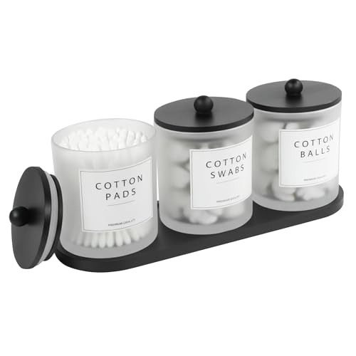 Vince Camuto Home Glass Cotton Jar Holder 鈥 Matte Black Lid, Elegant Bathroom Storage Canister for Qtips, Cotton Balls, Floss, Makeup Organizer, Vanity & Bathroom Organization