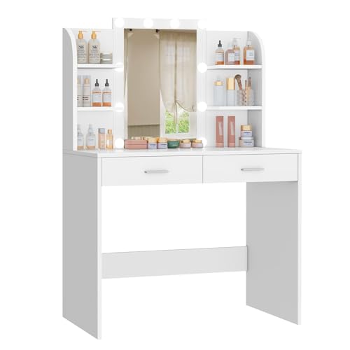 Garvee Vanity Desk Set with Stool, Makeup Vanity Table with Lights in 3 Colors, White Dressing Table Set with Charging Station, Drawers and Storage Shelves for Bedroom Women Girls