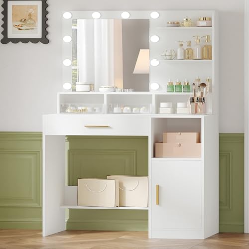 Farmhouse Vanity Set with Lighted Mirror, 10 LED Lights, 5 Metal Sliding Drawers, 3 Color Brightness Adjustable, 6 Open Shelves, Dressing Table for Women & Girls