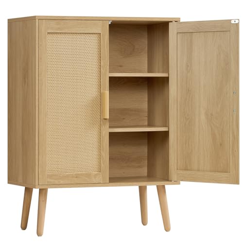 Merax Wood Sideboard Buffet Cabinet with 2 Sliding Doors and 3 Rattan Drawers, Adjustable Shelves, Safe Anti-Collision Rounded Top Edges, Ample Storage Space, Natural Color