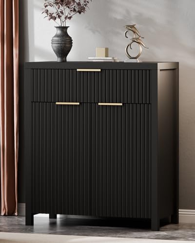 Jpiziso Buffet Cabinet with 3 Fluted Doors, Large Coffee Bar Table, Wooden Storage Cabinets, Modern Farmhouse Sideboard Credenza for Dining Room, Kitchen, Living Room, Black