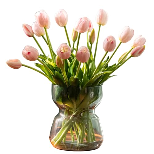Artificial Tulips Flowers in Glass Vase - 6 Pcs Faux Flowers in Vase with Faux Water 12.5" Fake Tulips Bouquet Floral Arrangement Centerpiece for Dining Table Home Wedding Office Decor, Peach Pink