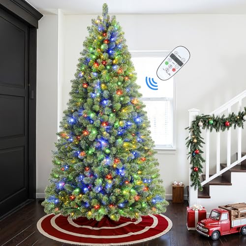 7.5 FT Pre-lit Christmas Tree, Artificial Pine Spruce Christmas Tree 1380 PVC Branch Tips 450 Warm White Lights, Easy Assembly with Metal Stand and Hinged Branches Decoration