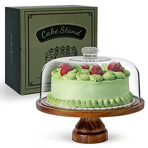 Wooden Cake Stand|Cake Stand 9 Inch Wooden with Clear Glass Lid Detachable Dome Multi-functional Holder for Party Dessert Cheese Fruit Display and Storage