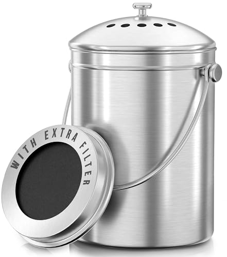Kitchen Compost Bin, 1.3 Gallon Metal Compost Bin for Kitchen Countertop 鈥 Odor-Free Composting Bucket with Sealed Lid & 1 Spare Charcoal Filter, Cream White