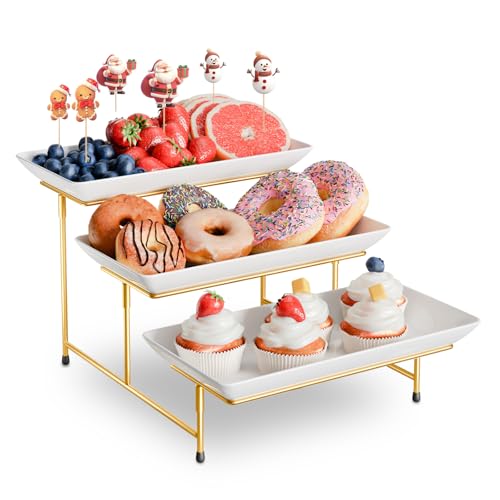 3 Tier Serving Trays for Party, Ceramic Serving Platters and Trays with Metal Stand, 3 Tier Buffet Server for Veggie Fruit Cookies Dessert