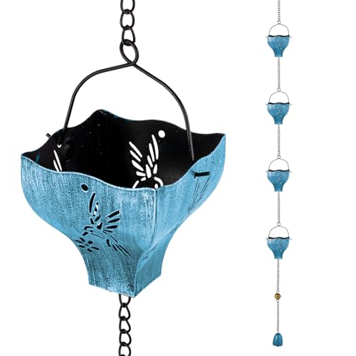 hogardeck 8.5FT Rain Chain with 12 Cups for Gutters Outside, Decorative Metal Rain Catcher with Adapter, Stake & Bell for Downspout Replacement, Garden Drainage, Eaves