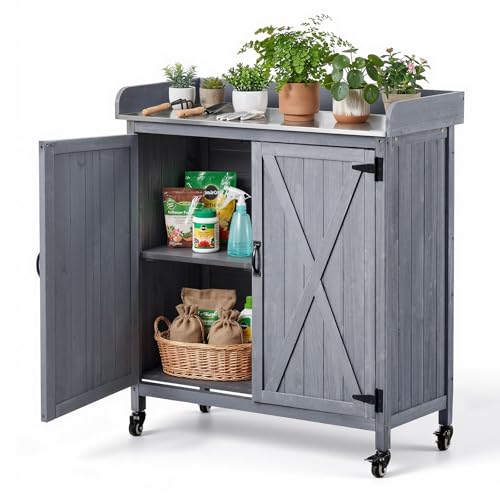 Merax 64.9" H Outdoor Potting Bench Table with Lockable Wheels, Solid Wood Outdoor Kitchen Island with Upper Hutch, Stainless Steel Top, Towel Rack, Outdoor Storage for Patio, Brown