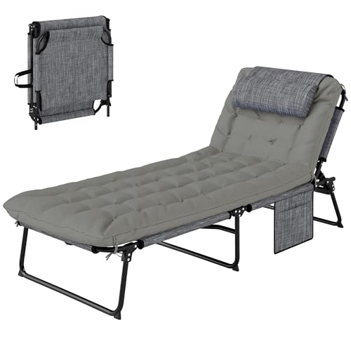 KOTEK Chaise Lounge Chair, 6-Position Folding Camping Cot with Padded Mattress, Pillow, Adjustable Camp Cot Bed for Outdoor/Indoor, Backyard, Garden, Patio, Beach, Pool or Office Use, Support 440 Lbs