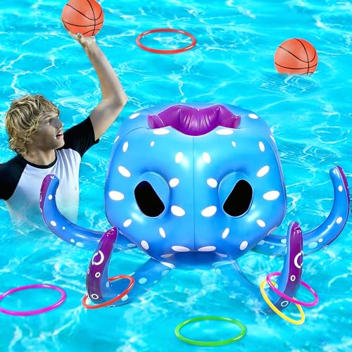 Pool Basketball Hoop,2-in-1 Floating Pool Basketball Toys with 4 Balls,12 Rings&Pump, Basketball & Ring Toss Swimming Pool Games, Summer Outdoor Water Play Toy for Kids 4-8 8-12,Blue